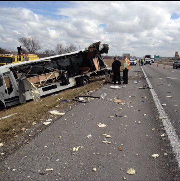 The bus had pulled over on the shoulder of the road due to a flat tire. A tractor-trailer veered out of its lane and ended up sideswiping the bus, pushing it part way down the bank of the interstate.